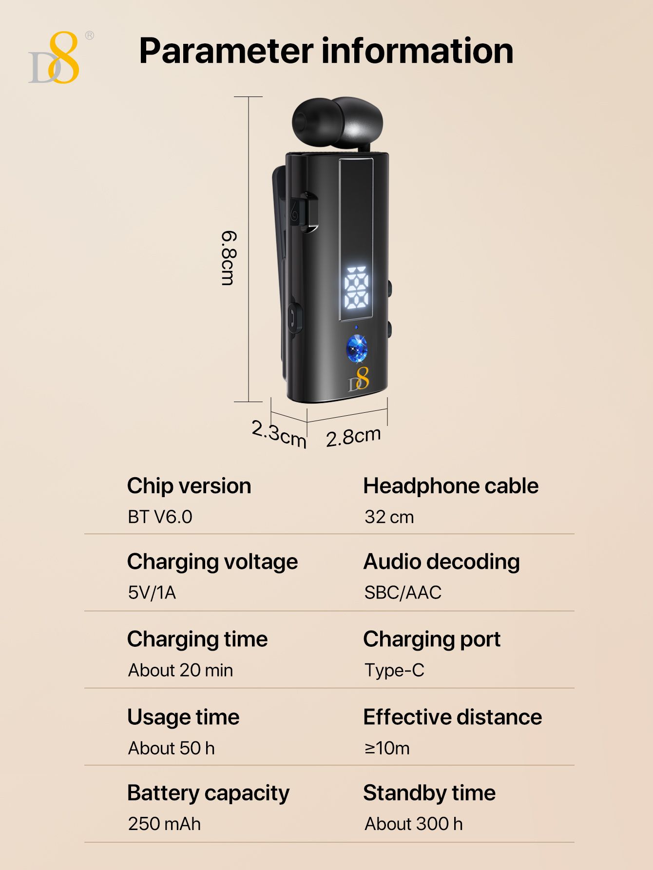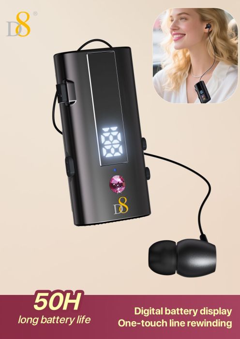 Bluetooth Collar Clip Headset (50H Long Battery Life, Digital Battery Display, One-Touch Line Rewinding, Diamond Accents, Black)