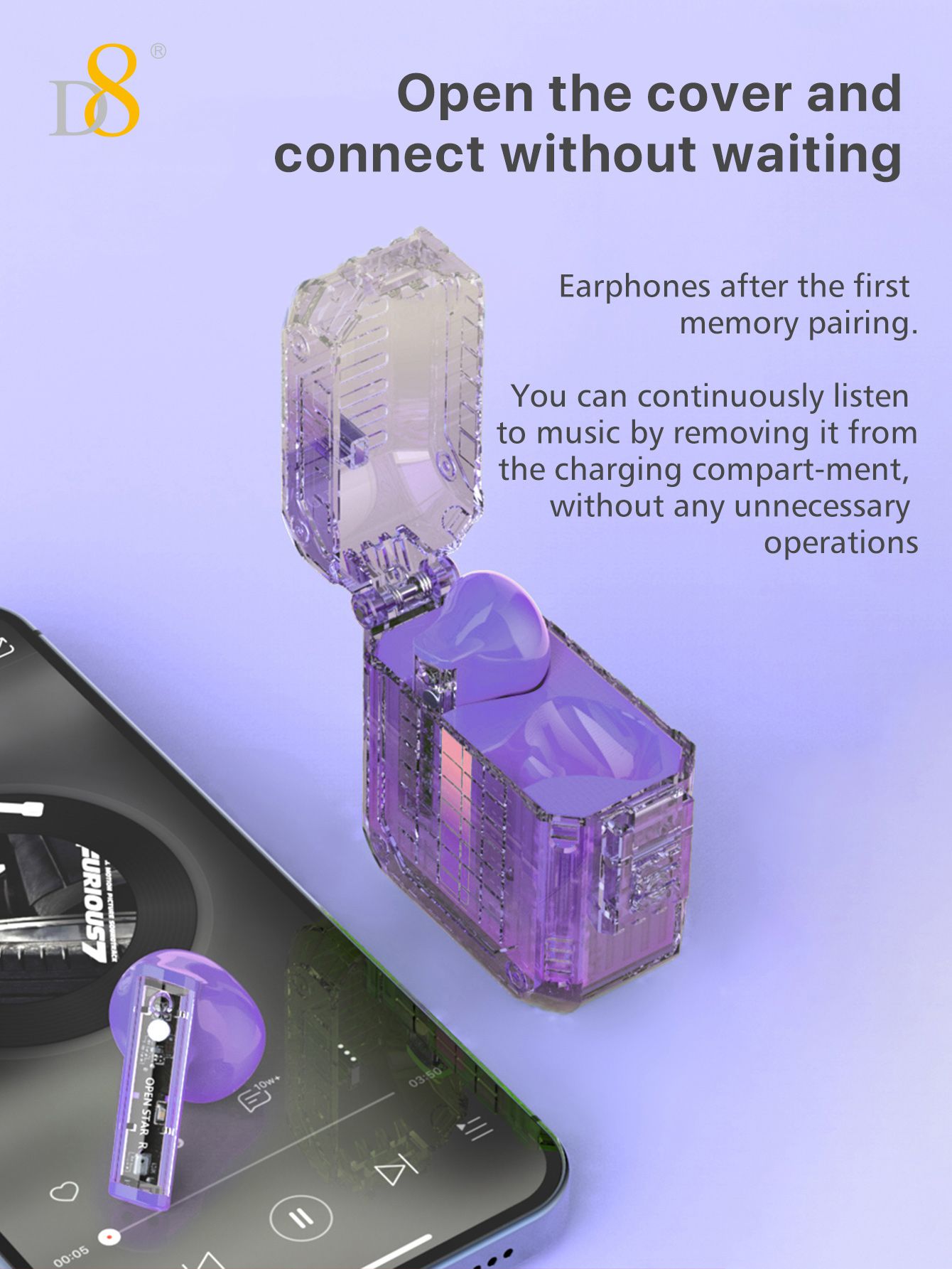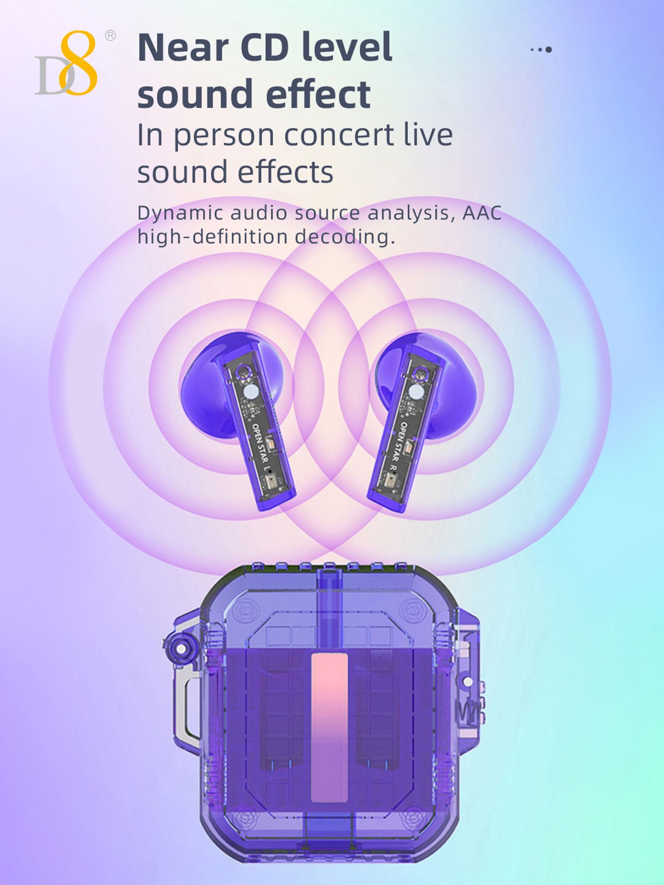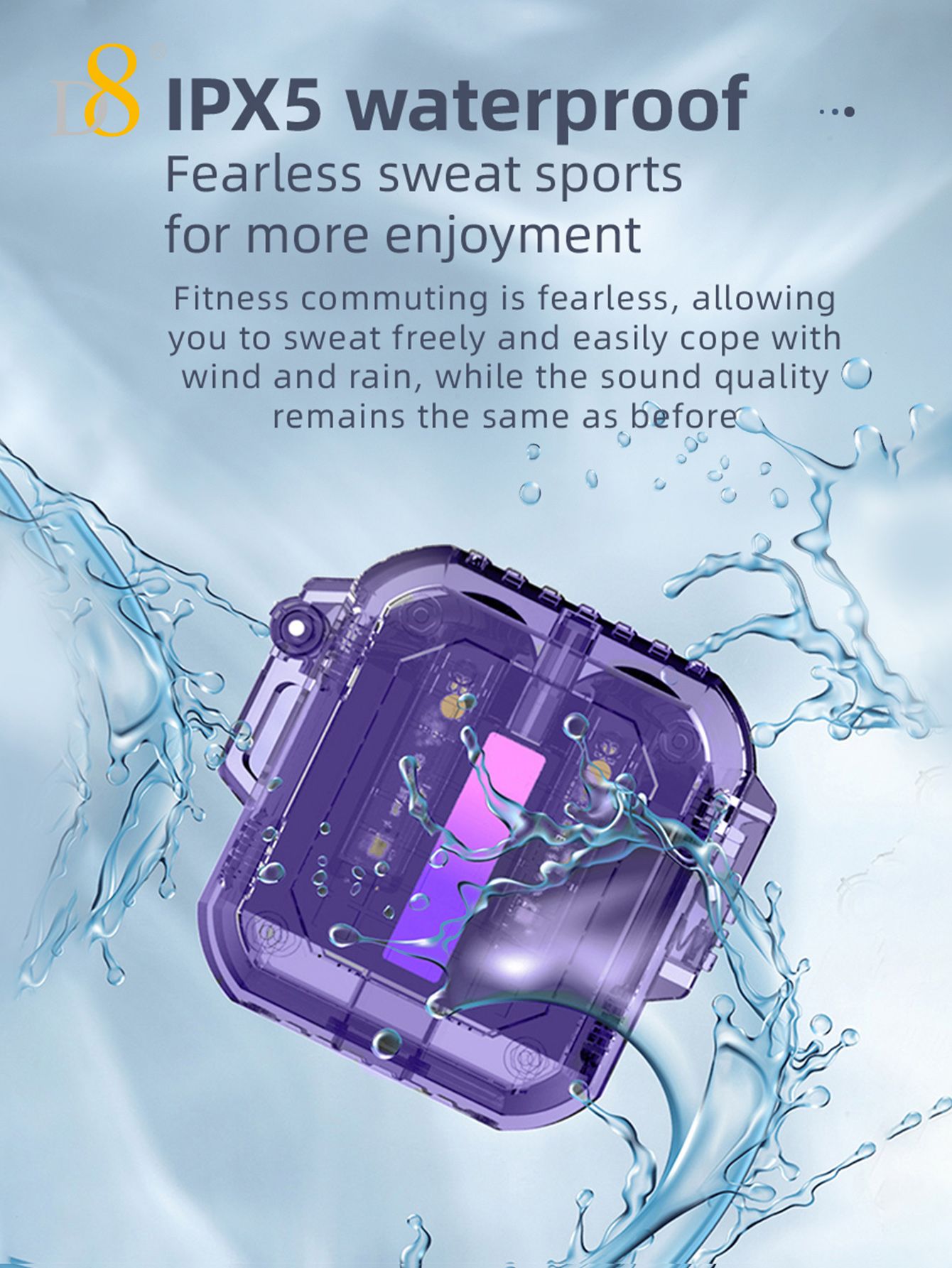 Bluetooth 5.3 TWS Earbuds (30H Total Battery with Charging Case, RGB Dazzling Light Effect, Near CD Level Sound, IPX5 Waterproof, Type-C Fast Charging, Touch Control, Transparent Purple Design)