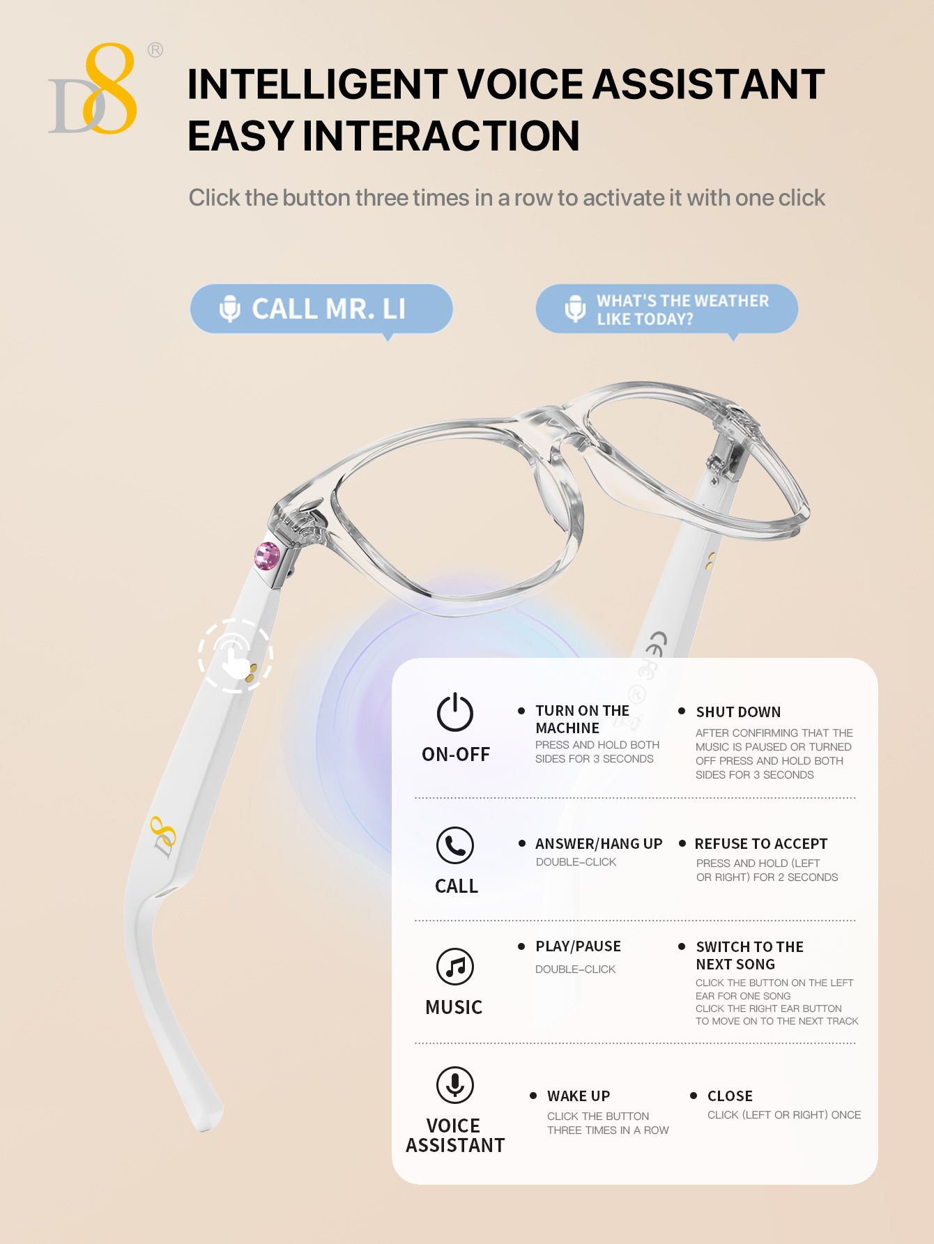 Translation Smart Glasses (Strong Battery Life, Semi Open Listening, Transparent Frame Design, White)