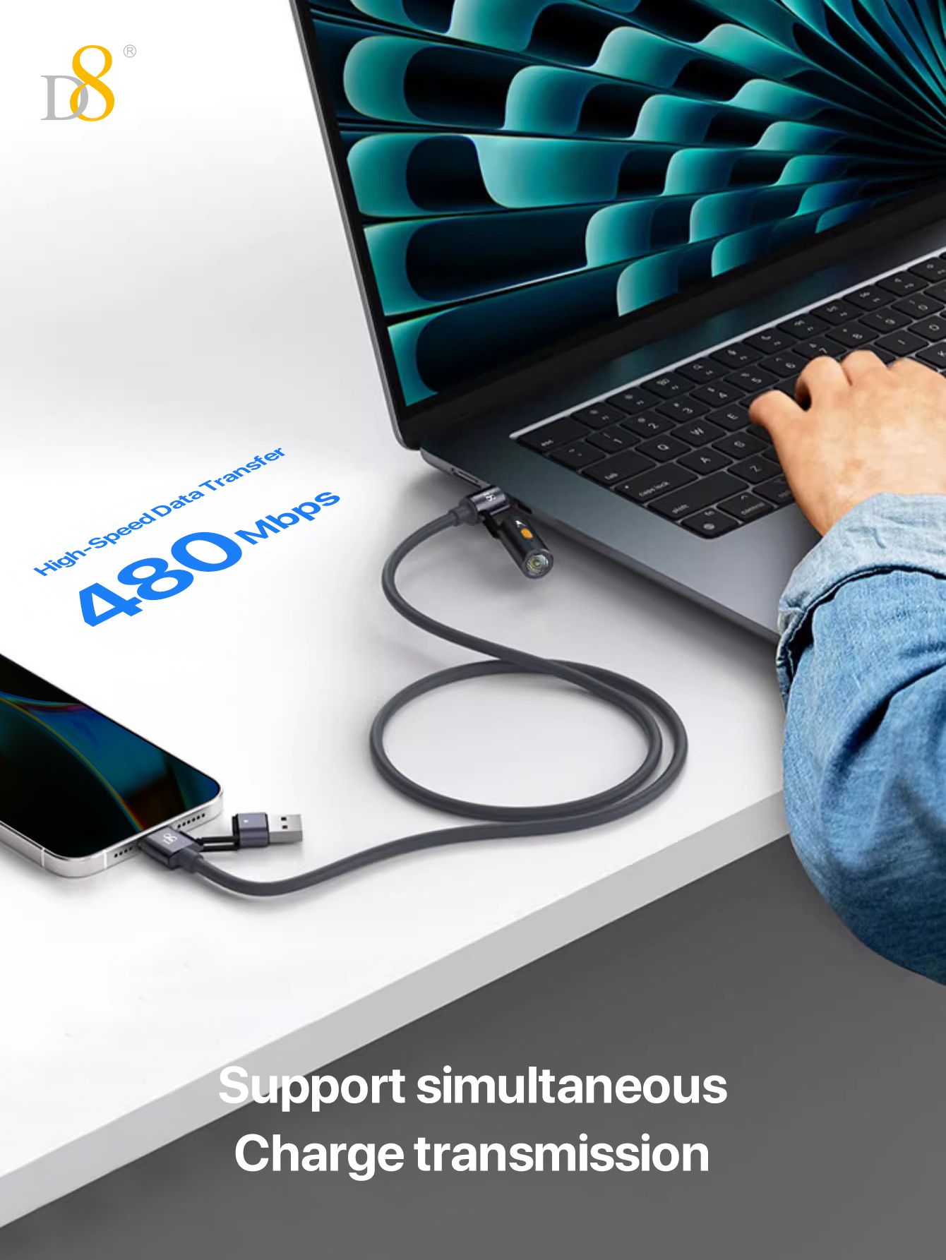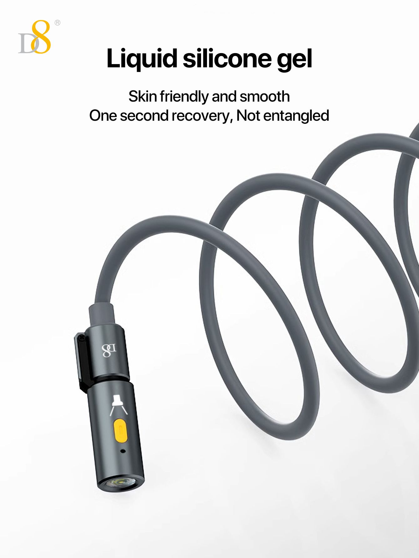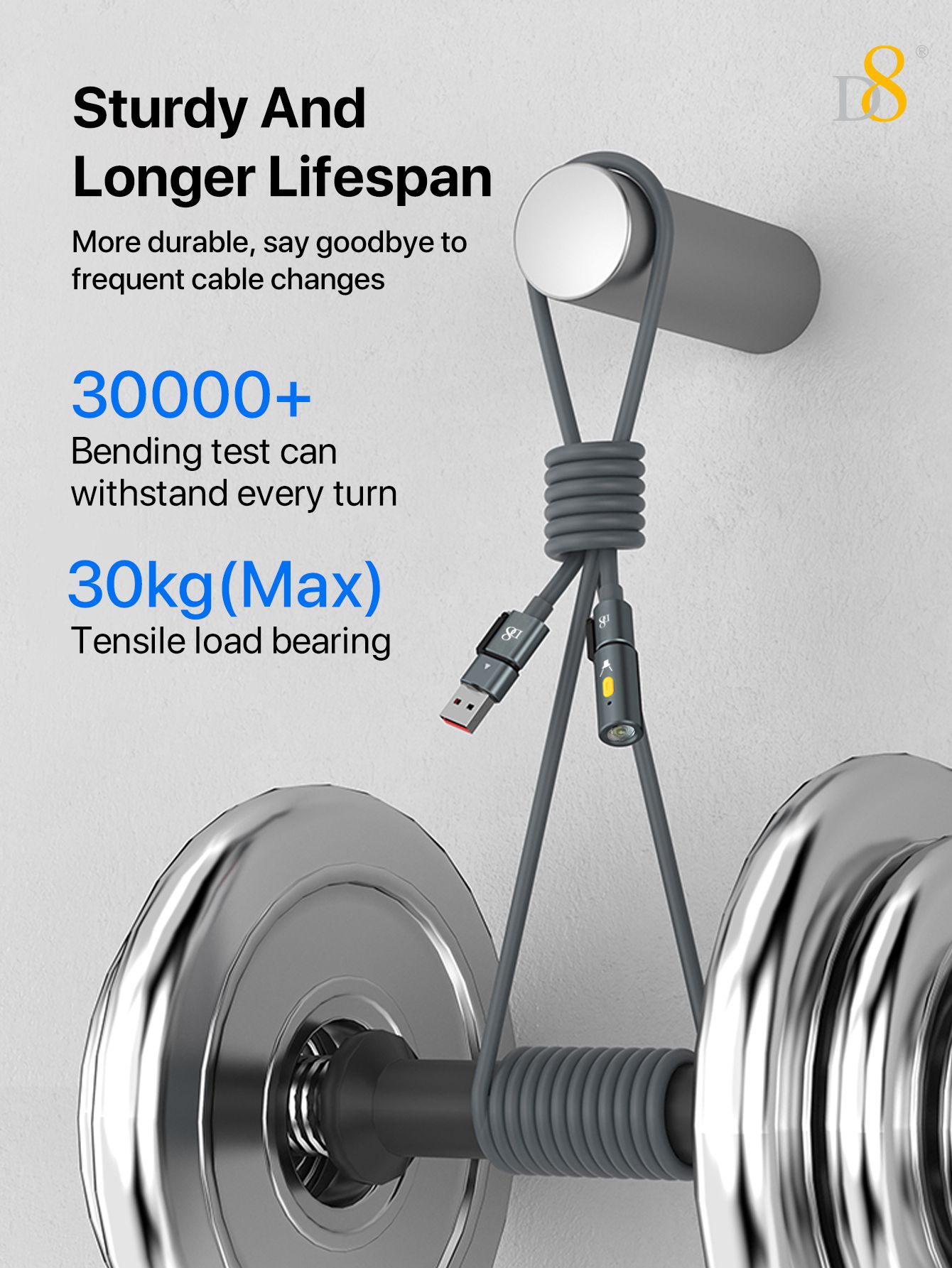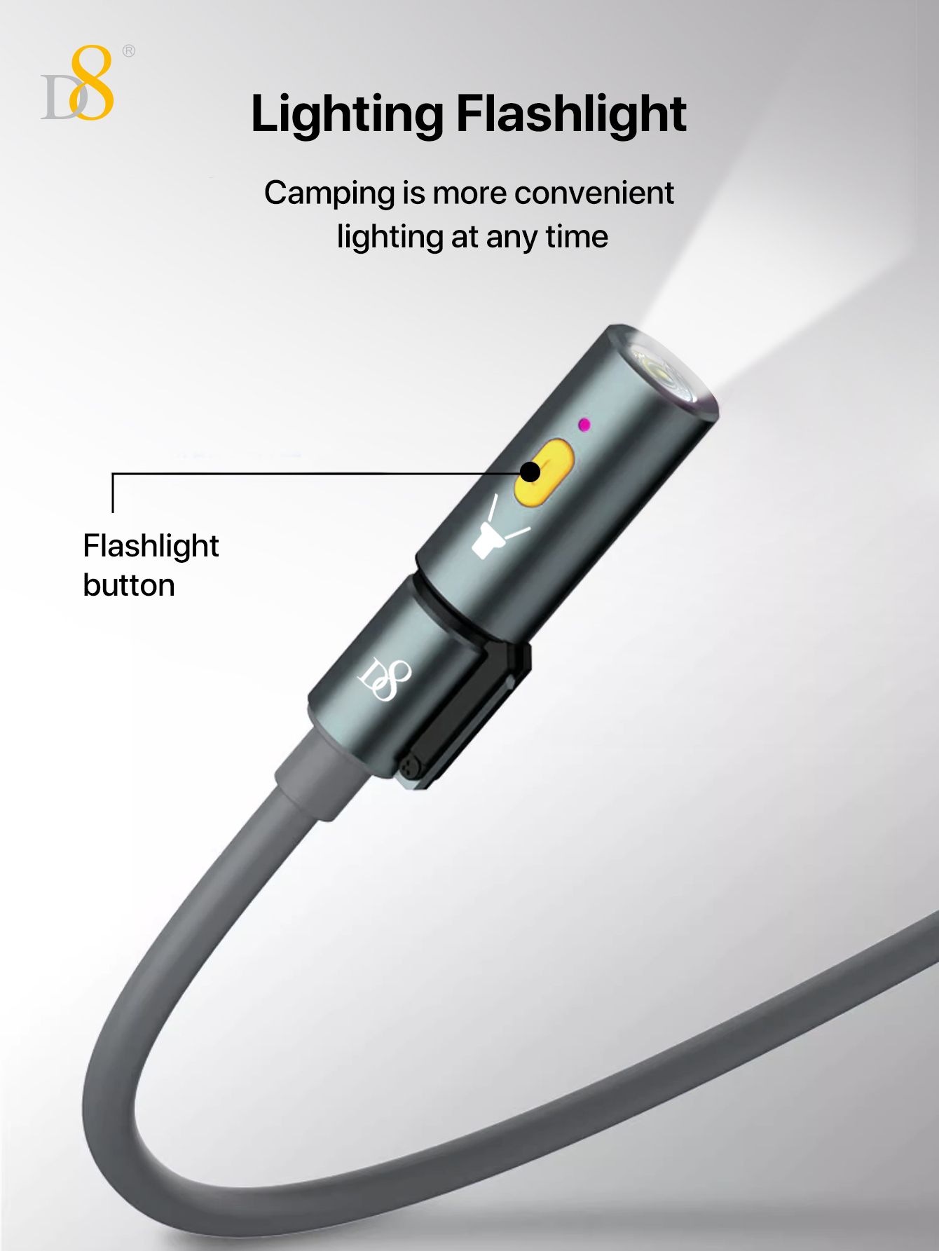 240W Fast Charging 2-in-1 USB-C & USB-A Cable with Flashlight (Outdoor Design, High-Lighted LED, Gray)