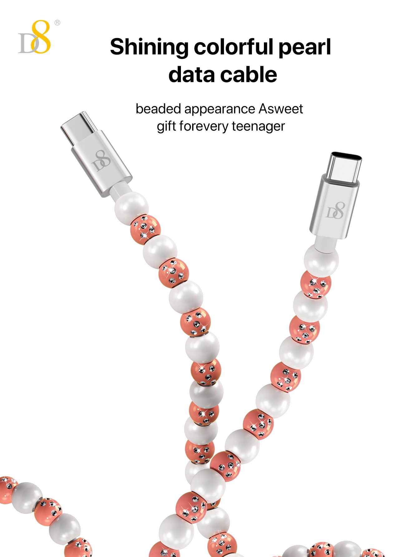 60W Fast Charging USB-C to USB-C Cable (Shining Colorful Pearl Beaded Design, Jewelry Style, Compatible with iPhone 16 & Samsung, Pink-Gray)