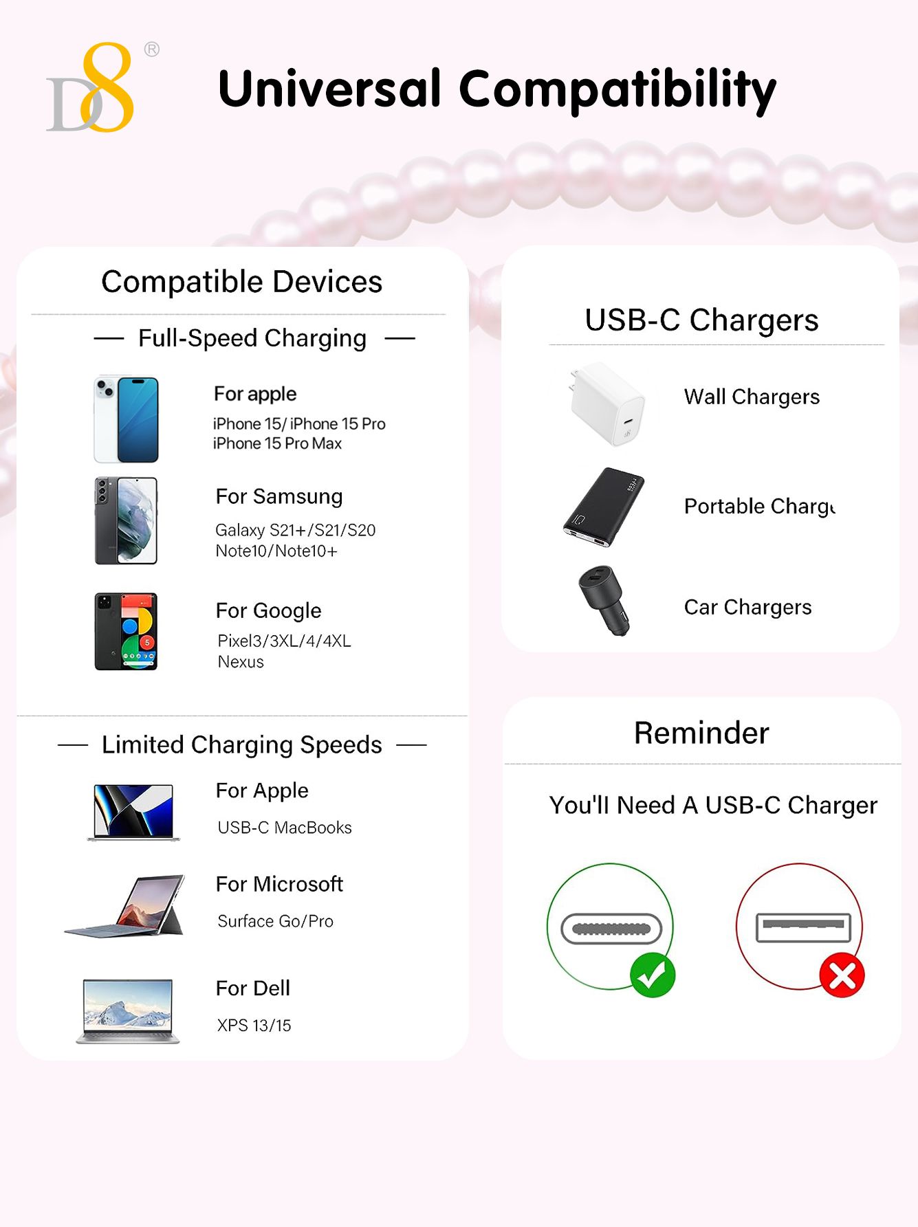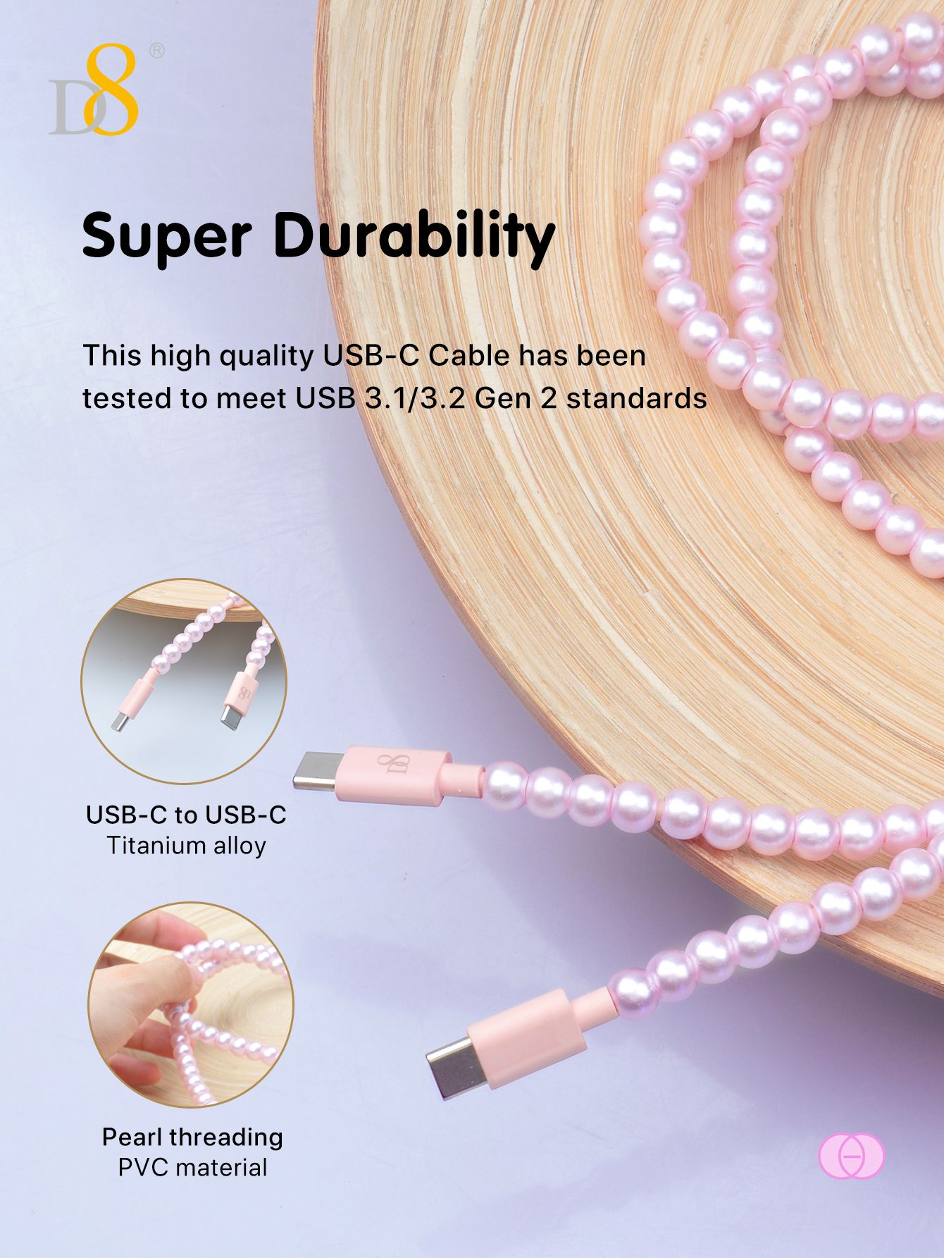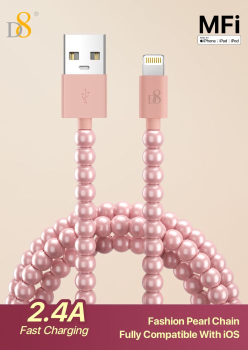 MFi Certified 2.4A Fast Charging USB-A to Lightning Cable (Fashion Pearl Chain Design, Fully Compatible with iOS, Pink)