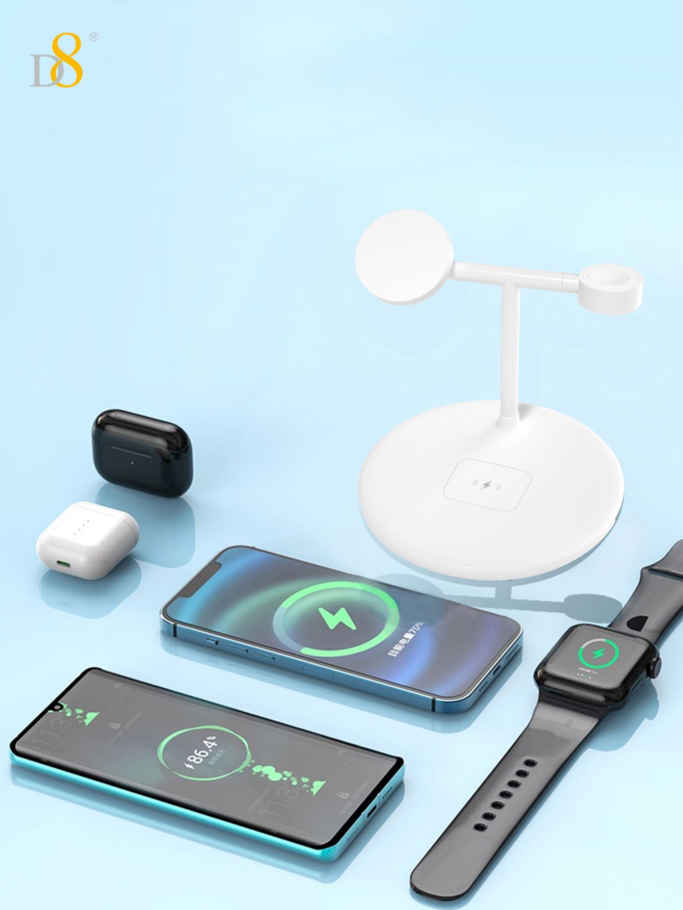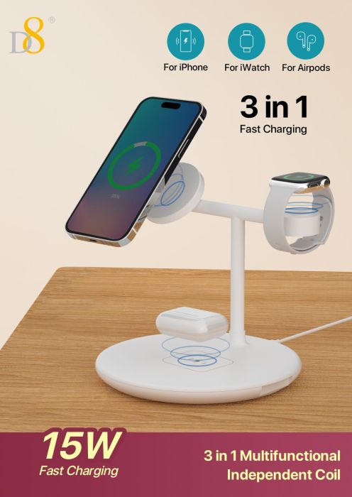 15W 3-in-1 Wireless Charger Stand (Independent Coils, Compatible with iPhone, iWatch & AirPods, White)