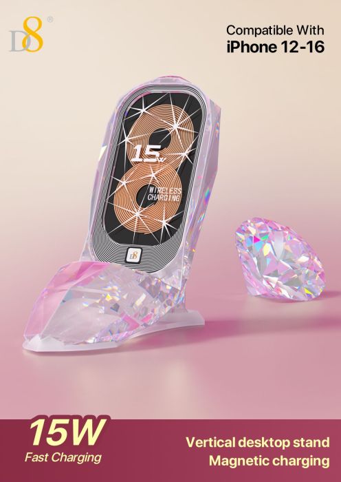 15W Diamond-Encrusted Magnetic Wireless Charger Stand (Vertical Design, Compatible with iPhone 12-16, Clear Pink)