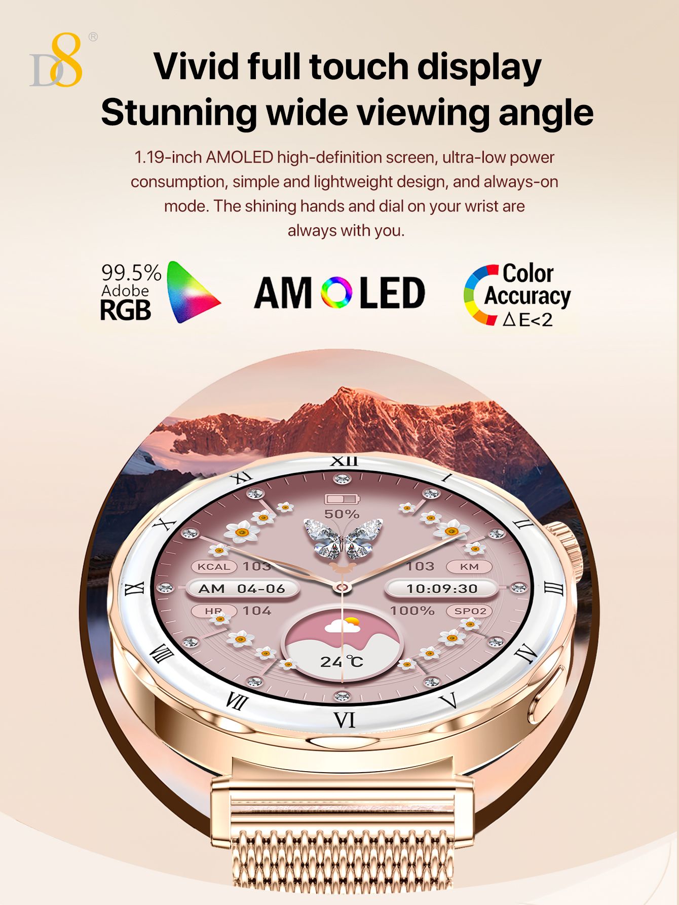 1.19" AMOLED Screen Bluetooth Calling Smart Watch (Gold Mesh Strap, Women's Fashion Style)