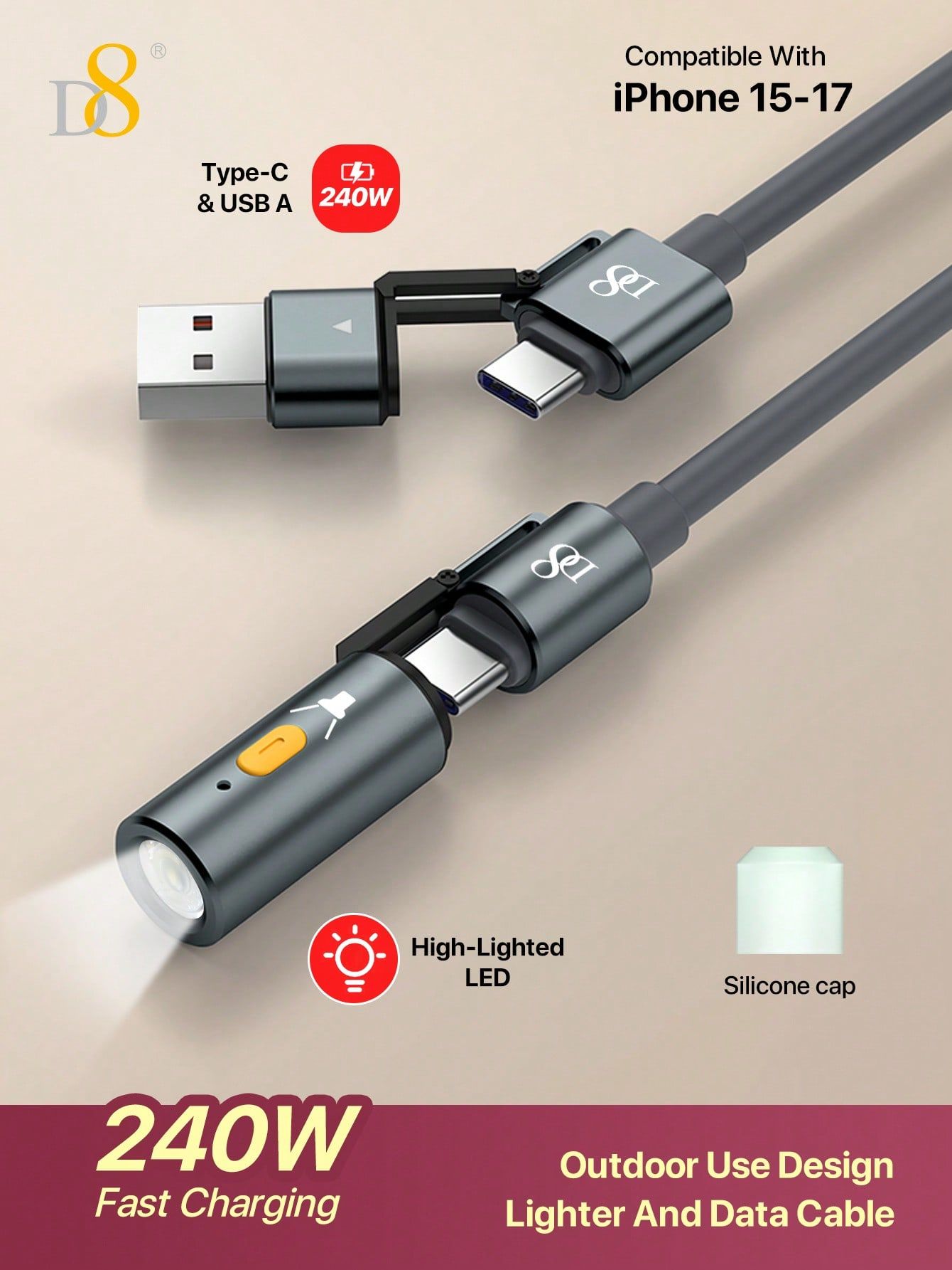 240W Fast Charging 2-in-1 USB-C & USB-A Cable with Flashlight (Outdoor Design, High-Lighted LED, Gray)