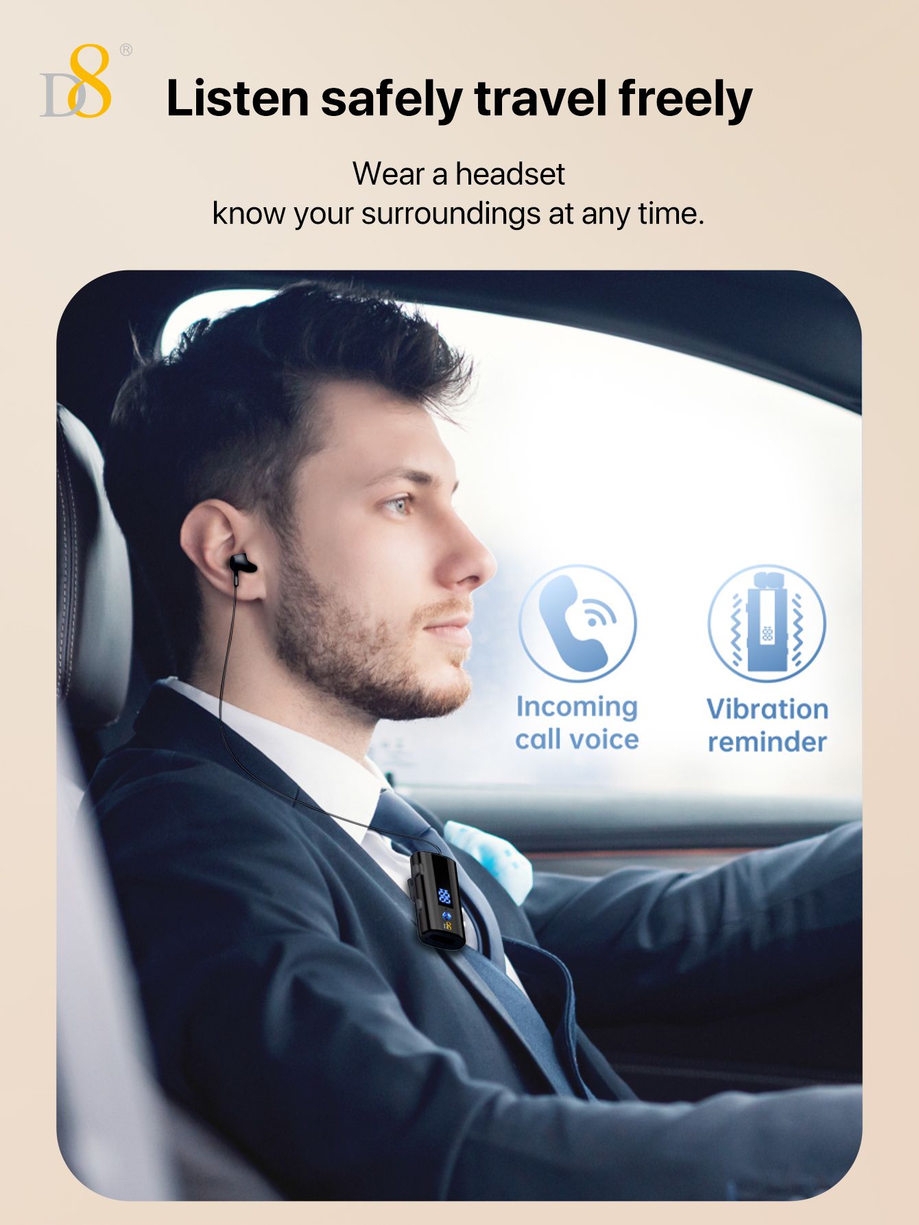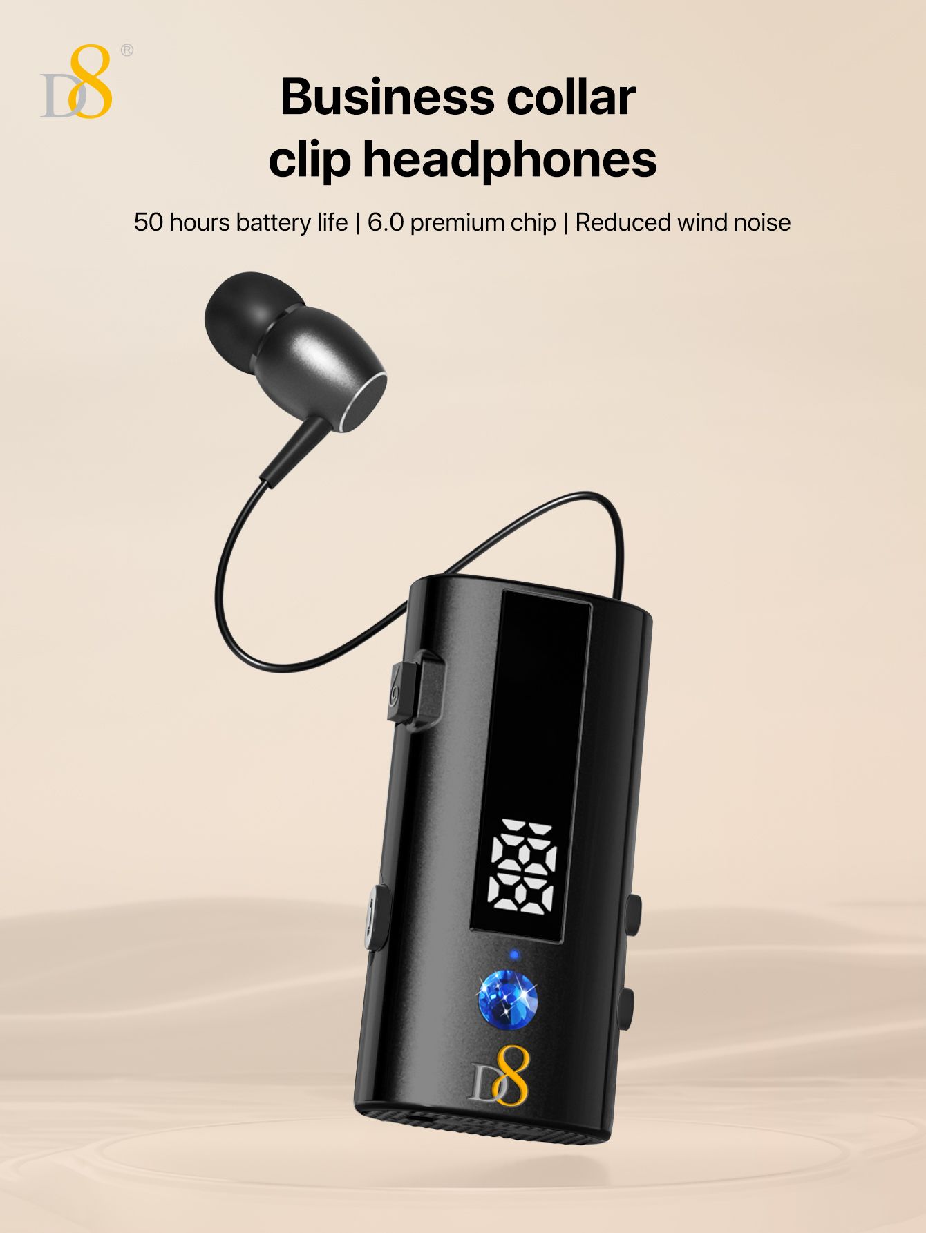 Bluetooth Collar Clip Headset (50H Long Battery Life, Digital Battery Display, One-Touch Line Rewinding, Diamond Accents, Black)