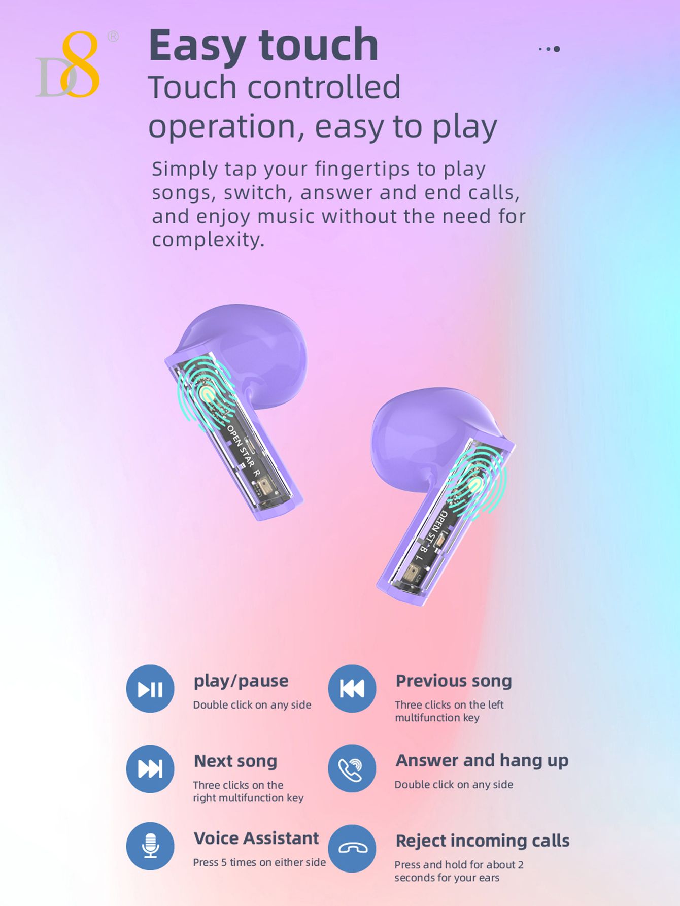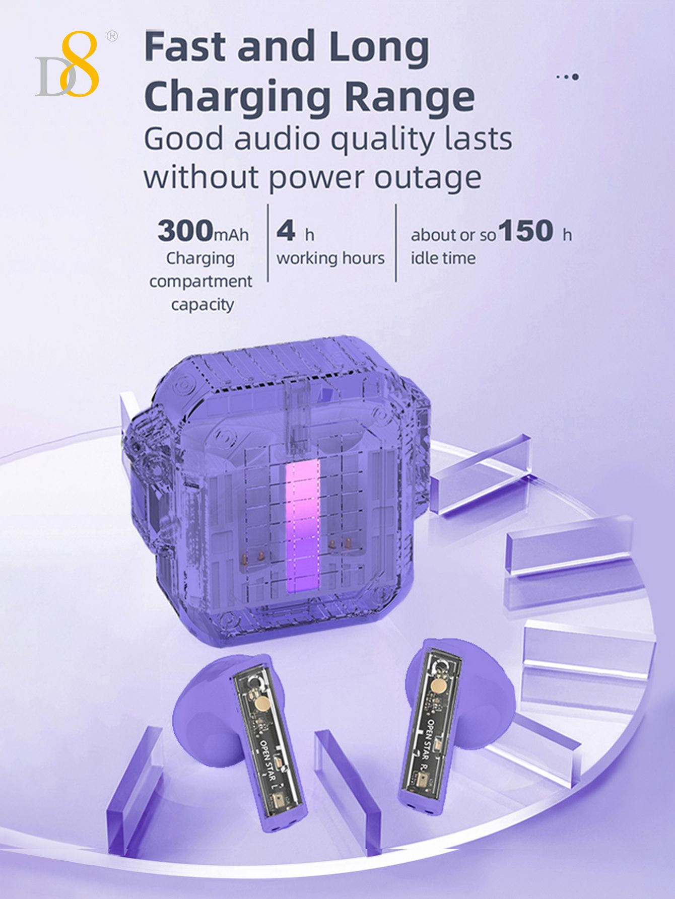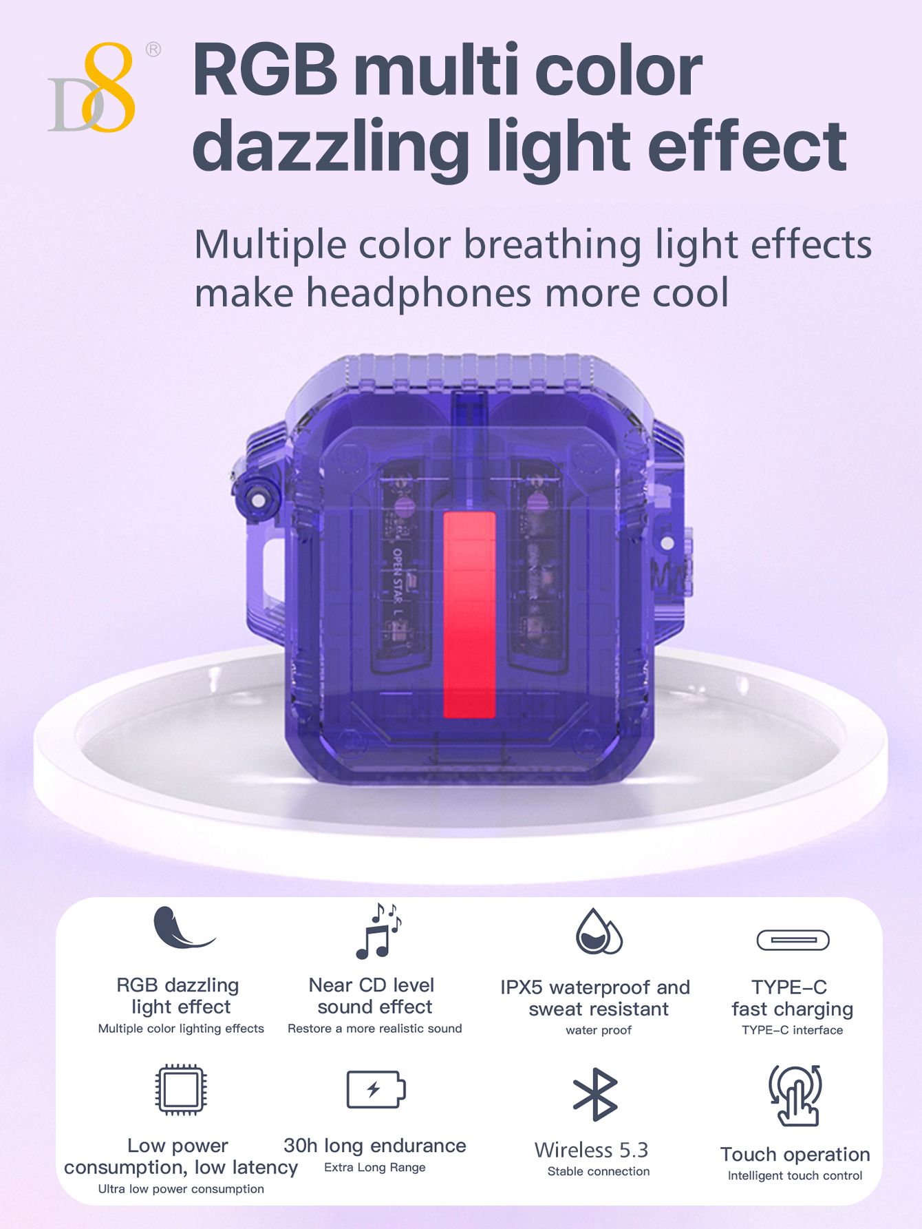 Bluetooth 5.3 TWS Earbuds (30H Total Battery with Charging Case, RGB Dazzling Light Effect, Near CD Level Sound, IPX5 Waterproof, Type-C Fast Charging, Touch Control, Transparent Purple Design)