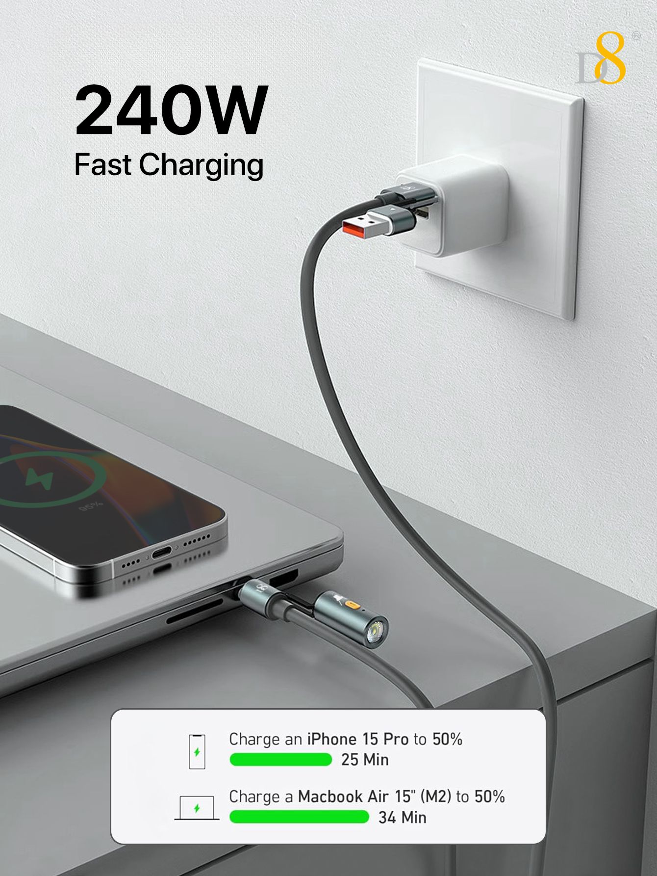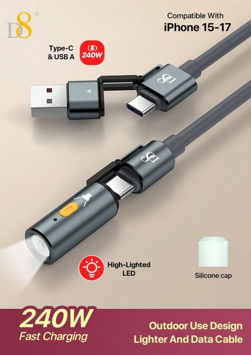 240W Fast Charging 2-in-1 USB-C & USB-A Cable with Flashlight (Outdoor Design, High-Lighted LED, Gray)
