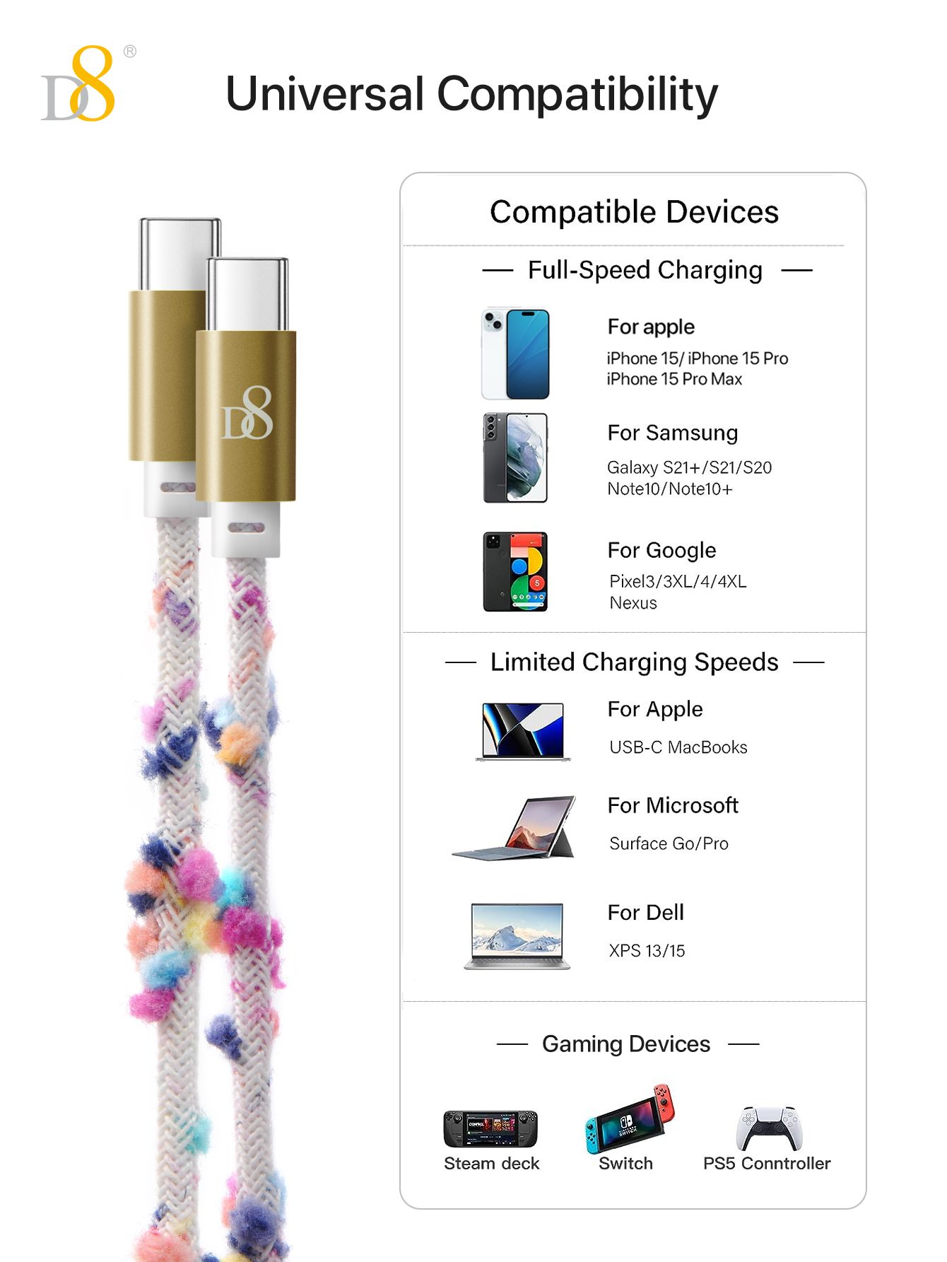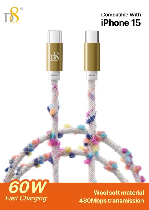 60W Fast Charging USB-C to USB-C Cable (Wool Soft Material, Colorful Pom-Pom Design, 480Mbps Transfer, Compatible with iPhone 15, White)