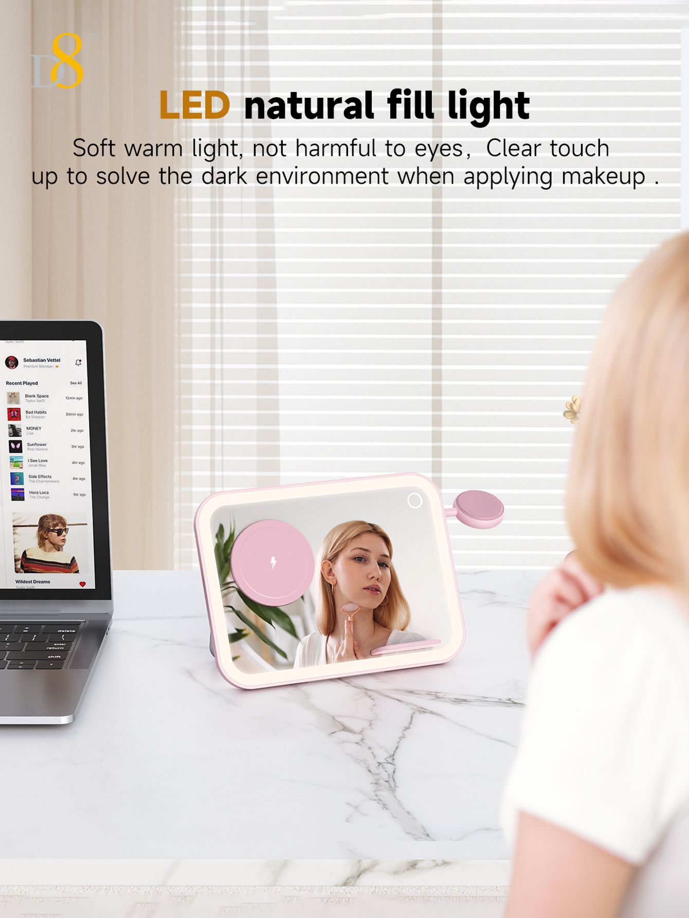 7.5W 3-in-1 Wireless Charging Makeup Mirror (Dimmable Ambient Light, Compatible with iPhone, iWatch & AirPods, Pink)